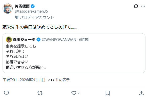 | … | 90無念Nameとしあき26/03/05(木)14:50:43No.1391746371そうだねx4>で、森川ジョージさんはどういうことをしているのですか? |