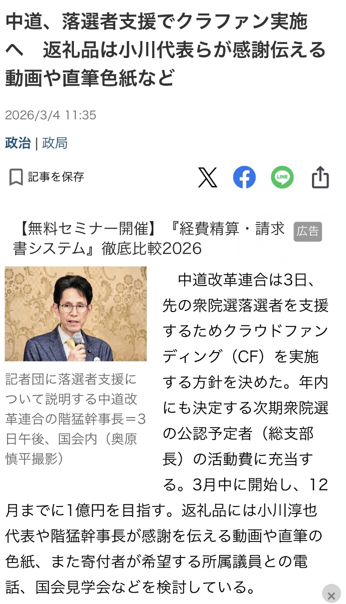 | … | 120無念Nameとしあき26/03/05(木)17:55:54No.1391775719+クラファンで1億円集めて落選議員を養うとは言うけど…1億で足りるの? |