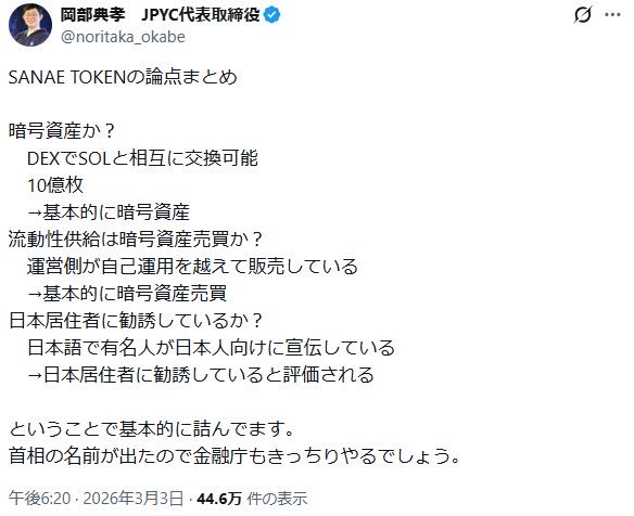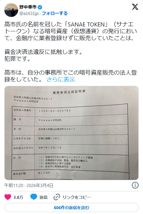2月25日に発売された暗号通貨「SANAE TOKEN(サナエトークン)」、無登録販売の容疑で金融庁が調査へ!高市総理本人は「全く知らない」と関与を否定するも運営元住所が総理の事務所!