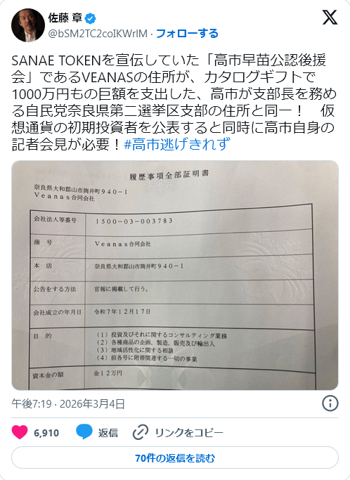 | … | 77無念Nameとしあき26/03/05(木)17:11:03No.1391767854+>SANAE TOKENを宣伝していた「高市早苗公認後援会」であるVEANASの住所が、 |