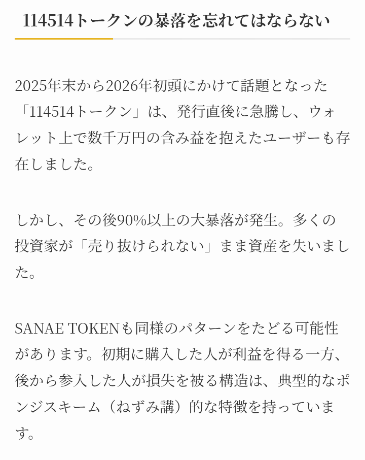 | … | 353無念Nameとしあき26/03/05(木)19:11:53No.1391792310+ 1772705513879.png-(164254 B) 仮想通貨情報サイトのSANAE TOKEN解説ページで危険性と問題点として公認ってのはウソ臭ぇなと指摘されてた |