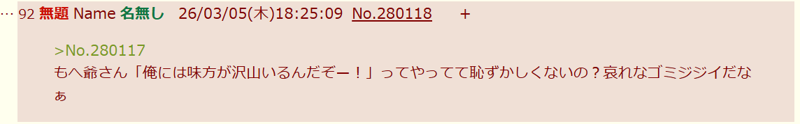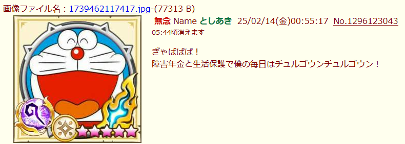 | … | 120無念Nameとしあき26/03/06(金)01:41:13No.1391882289そうだねx1>>ママから留守番代貰おうとする統失のソンキくんが何か言ってる |