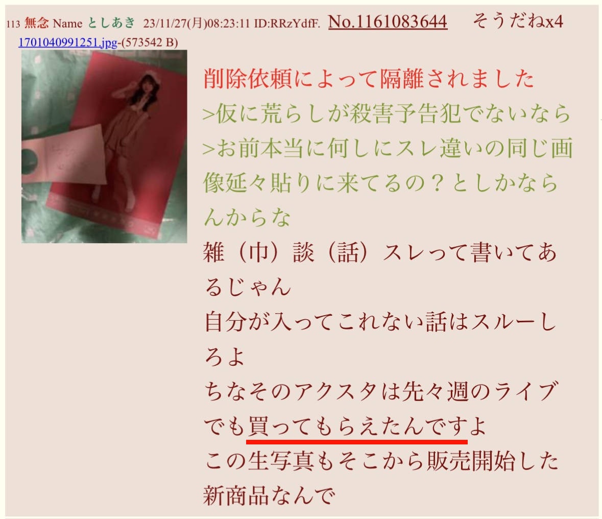 | … | 47無念Nameとしあき26/03/05(木)23:43:46No.1391865354そうだねx3書き込みをした人によって削除されました |