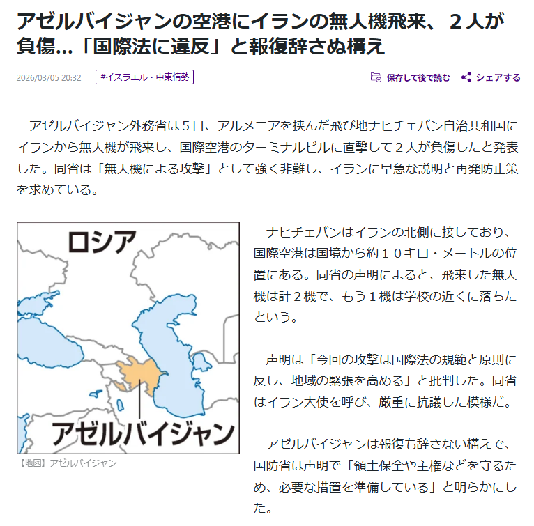 | … | 992無念Nameとしあき26/03/06(金)05:55:34No.1391892565+アゼルバイジャンへのドローン攻撃はイスラエルって発表してるがアゼルは納得してくれるんです? |