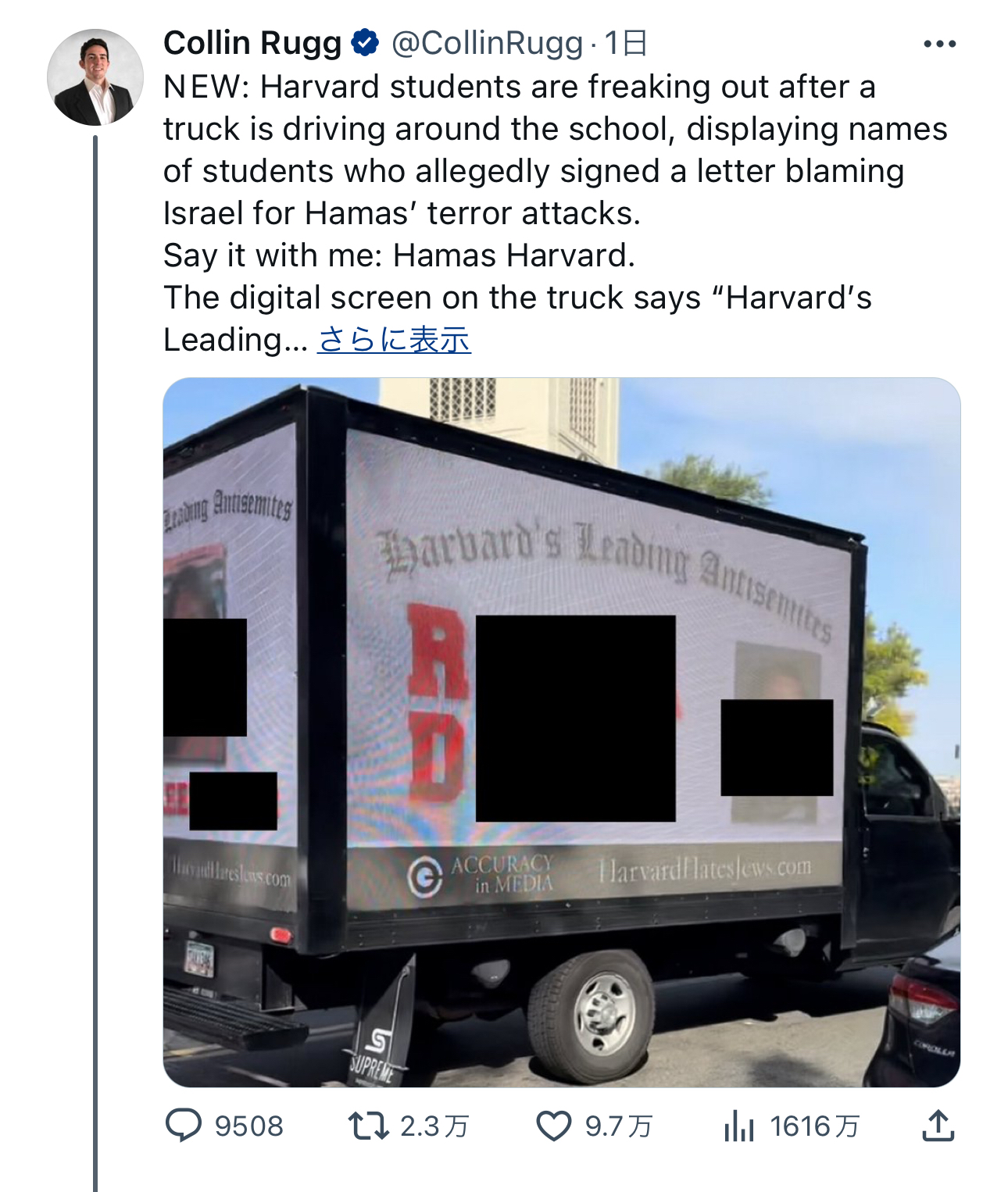 | … | 967無念Nameとしあき26/03/06(金)05:06:24No.1391891194+>【速報】ハーバードでイスラエル非難に署名したやつを晒すトラック |