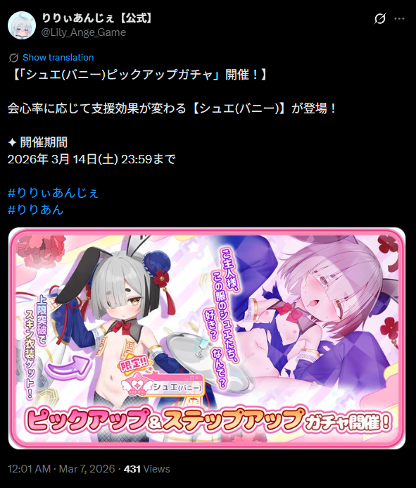 | … | 1無念Nameとしあき26/03/06(金)23:50:53No.1392083297+ 1772808653375.jpg-(789269 B) 【「セーヌ(バニー)ピックアップガチャ」開催!】 |