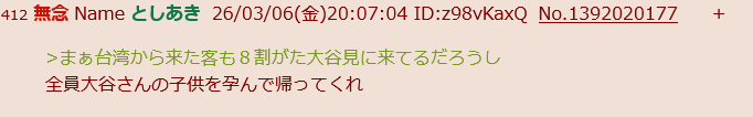 | … | 182無念Nameとしあき26/03/07(土)09:03:41No.1392130162+普段は野球なんて興味ないうちのオヤジもオータニオータニ言ってて怖い |