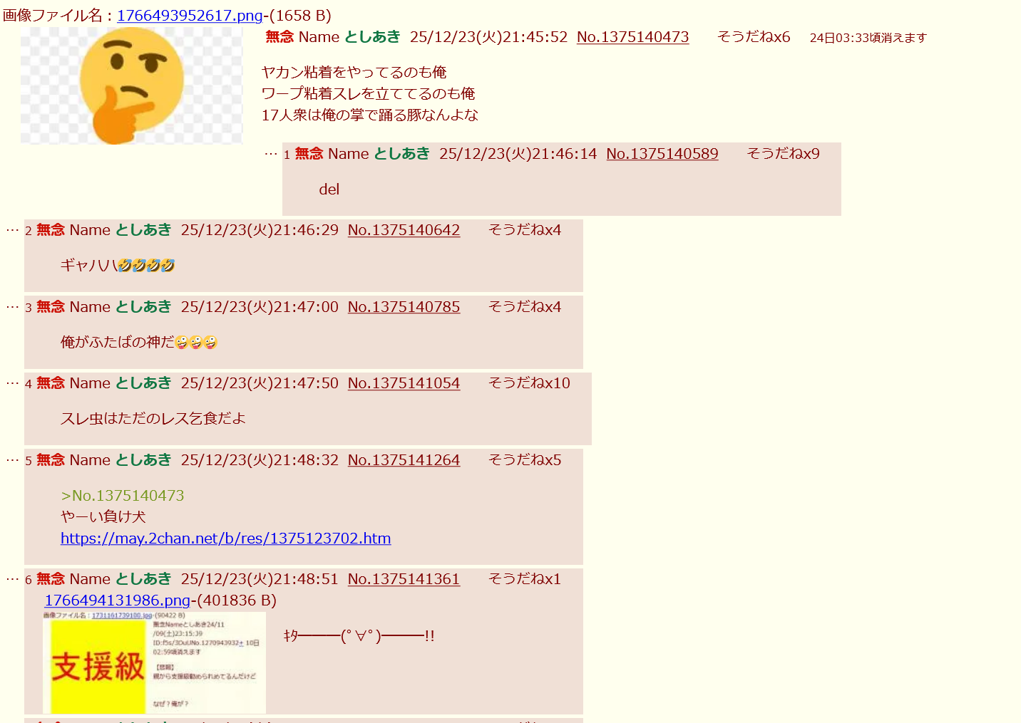 | … | 274無念Nameとしあき26/03/07(土)18:56:07No.1392248259+ソンキくんしつこいよね |