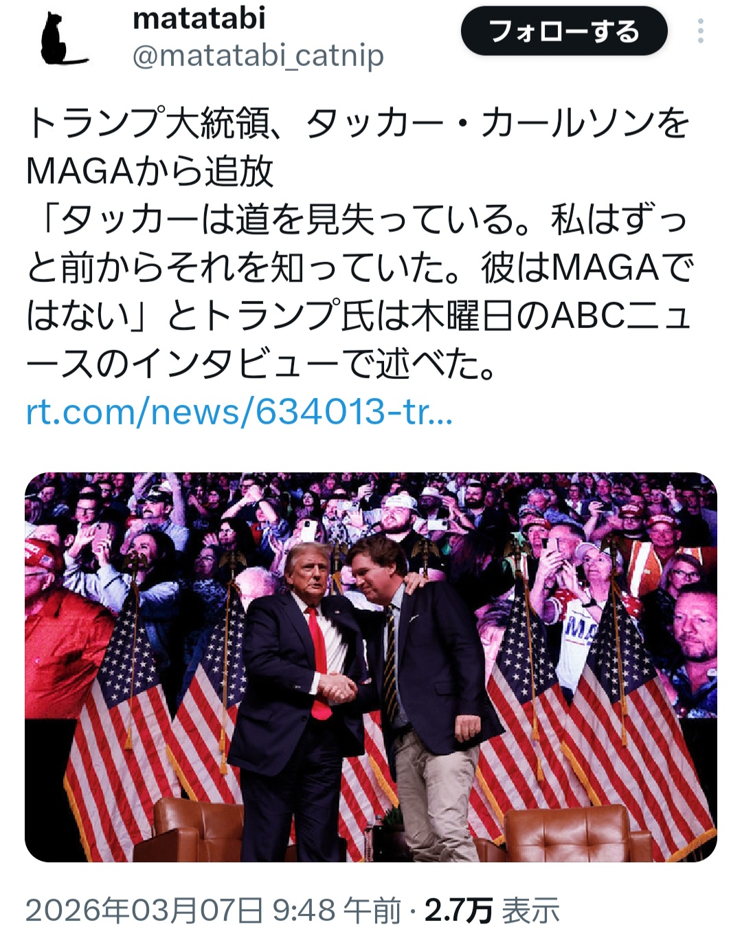 | … | 56無念Nameとしあき26/03/07(土)16:11:59No.1392212591+>戦争する代わりにその金を国内に使ってアメリカを偉大にするトランプさん |