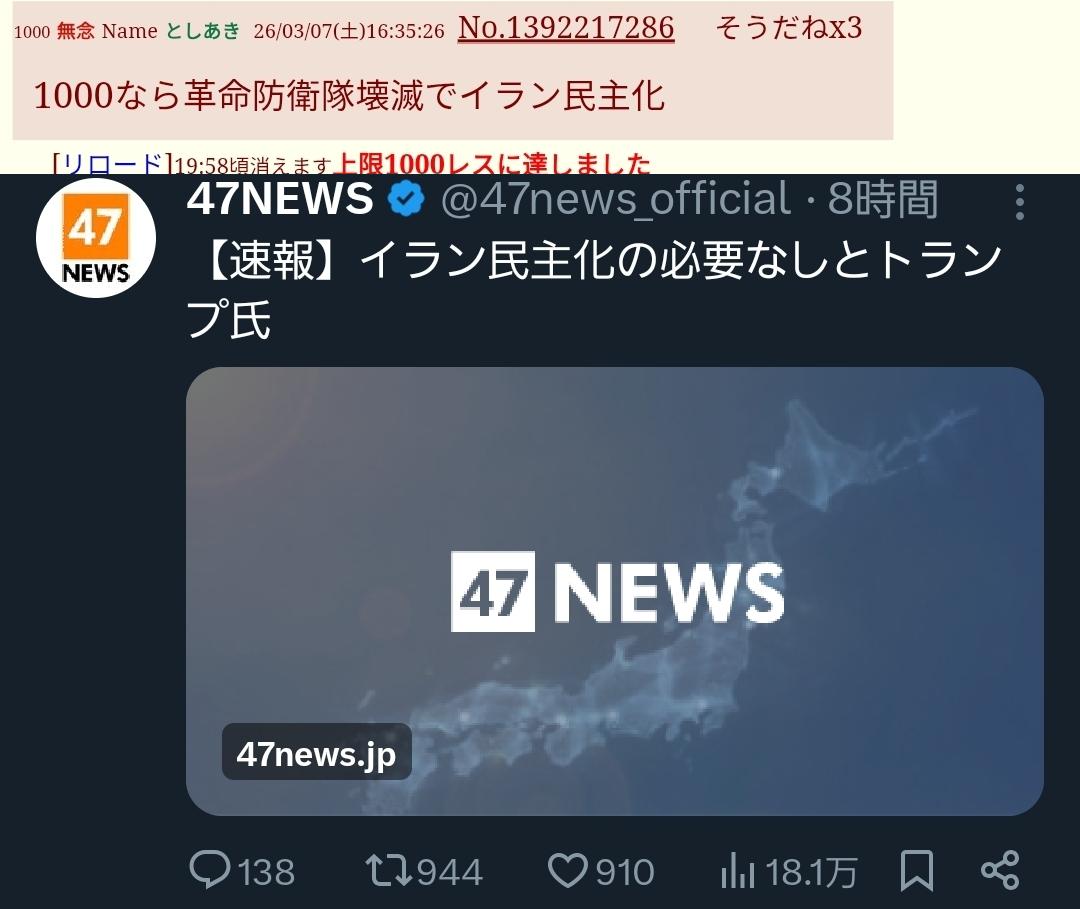 | … | 2無念Nameとしあき26/03/07(土)16:36:50No.1392217602+ 1772869010384.jpg-(361185 B) https://x.com/i/status/2030181861885104607 |