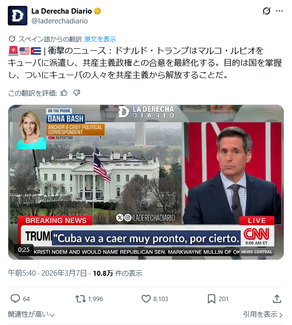 | … | 62無念Nameとしあき26/03/07(土)17:08:10No.1392224042そうだねx13>トランプ氏、「キューバはまもなく陥落」とCNNに発言 ルビオ国務長官を派遣へ |