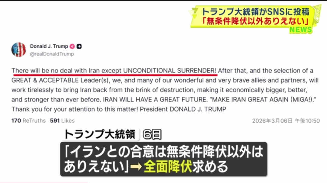 | … | 277無念Nameとしあき26/03/07(土)18:48:36No.1392246461+>>無条件降伏って国ごと渡しますって意味? |