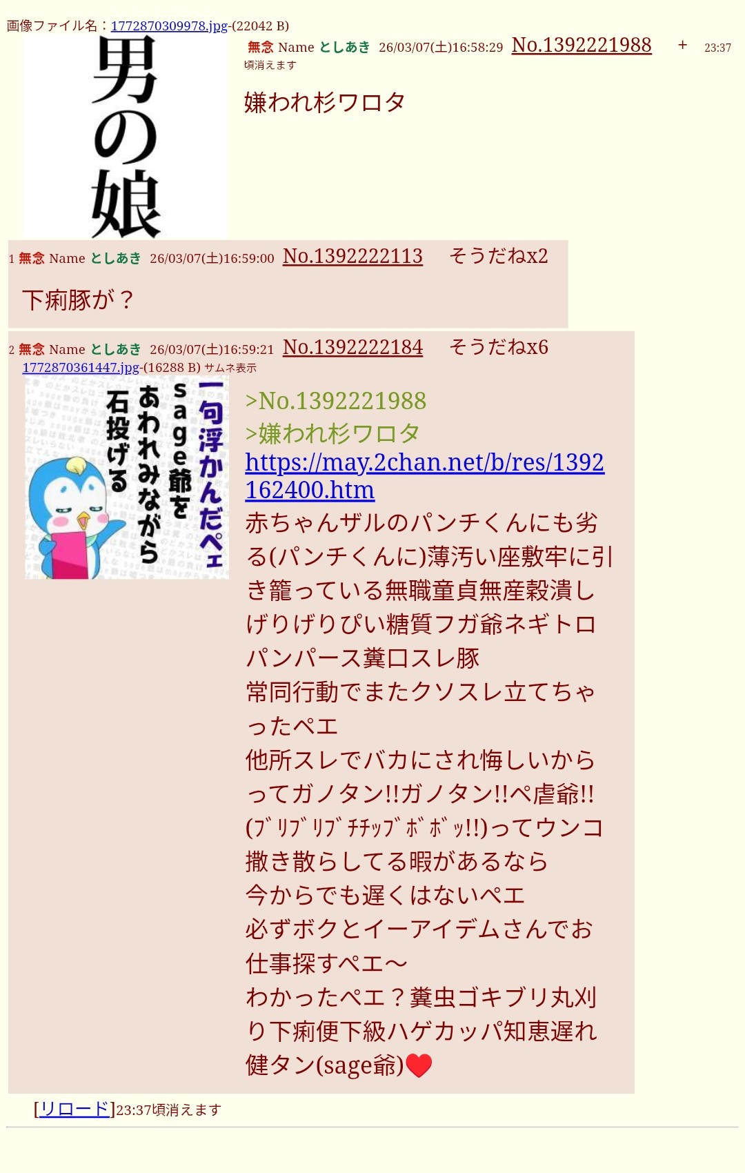 | … | 67無念Nameとしあき26/03/07(土)17:21:12No.1392226603そうだねx5>うんこガノタン^〜 |