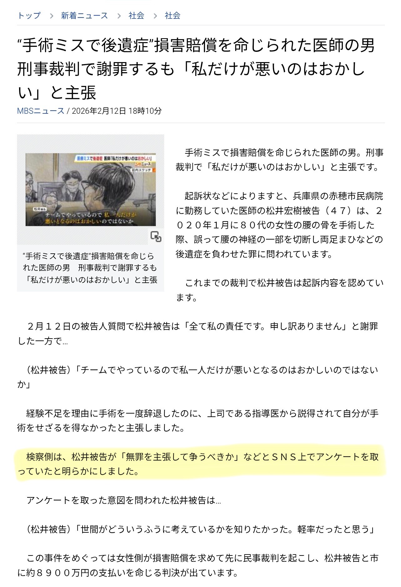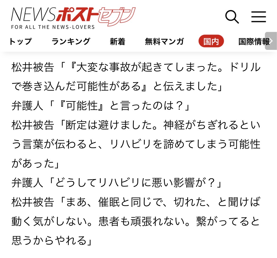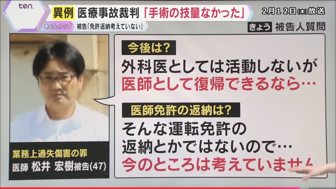 | … | 1無念Nameとしあき26/03/07(土)17:01:18No.1392222580+また被告は「手術直後、事故を家族に説明した」と証言していたが、これも被告の見解と異なる内容が陳述された。家族はなんと「歩けるようになる」と説明をされていたのだという。 |