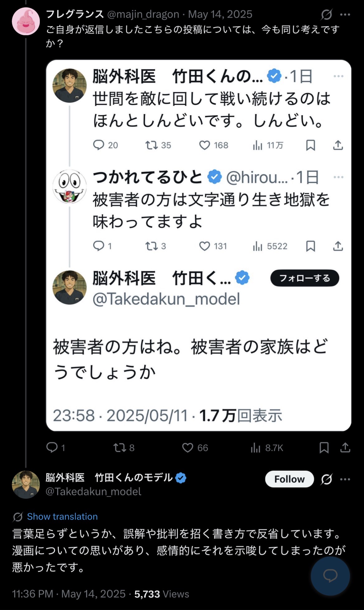 | … | 102無念Nameとしあき26/03/07(土)19:16:56No.1392253636そうだねx2>どういう理屈かわからないけど竹田くんは元同僚や被害者家族が黙れば勝ちだと思ってるんだよな何故だろう |