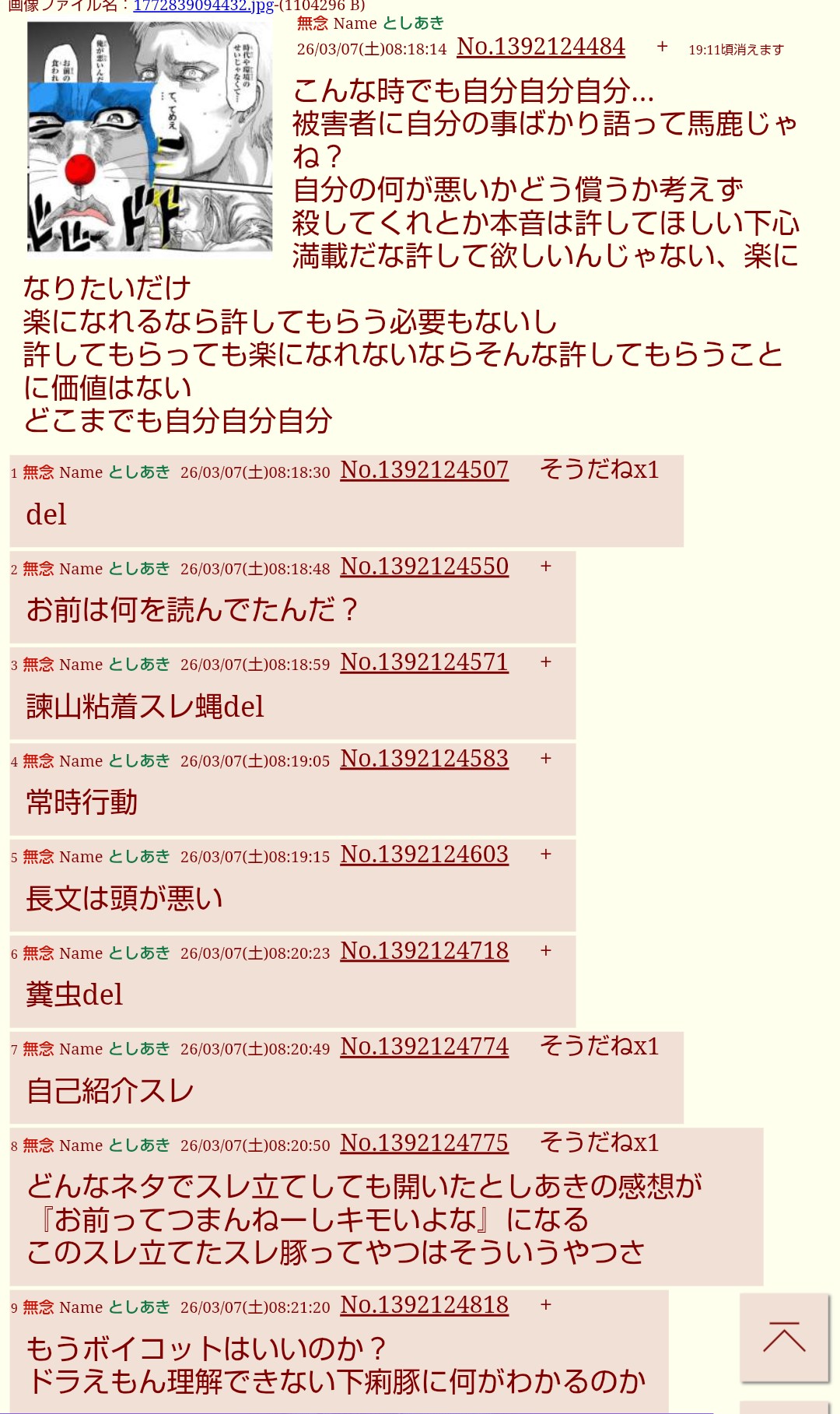 | … | 3無念Nameとしあき26/03/07(土)19:12:33No.1392252461そうだねx3この世界から消え失せろ害虫 |