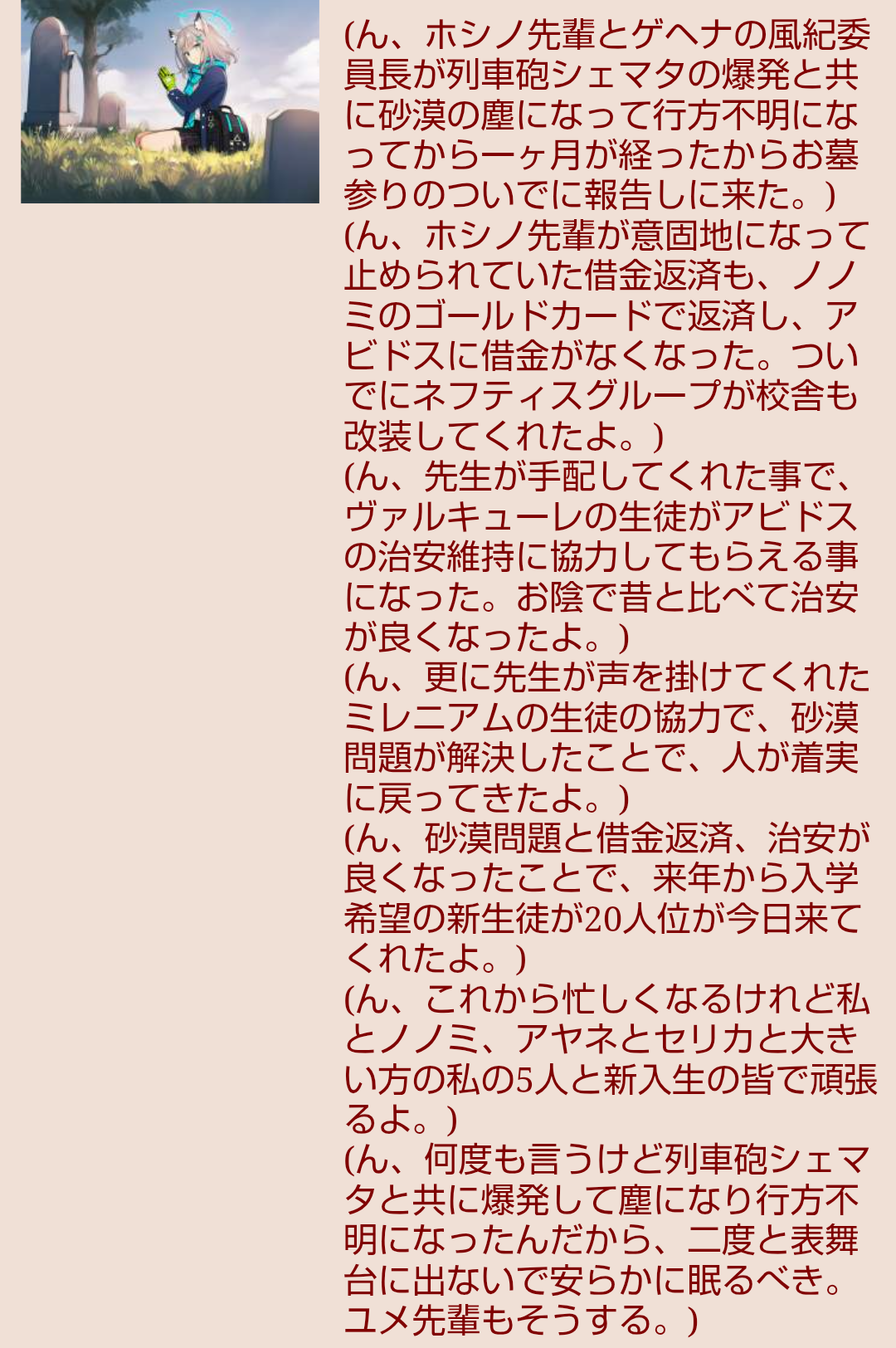 | … | 31無念Nameとしあき26/03/07(土)21:18:04No.1392292401そうだねx1>ブルアカの凄いところは出番が多くても全然掘り下げできないところわよ |