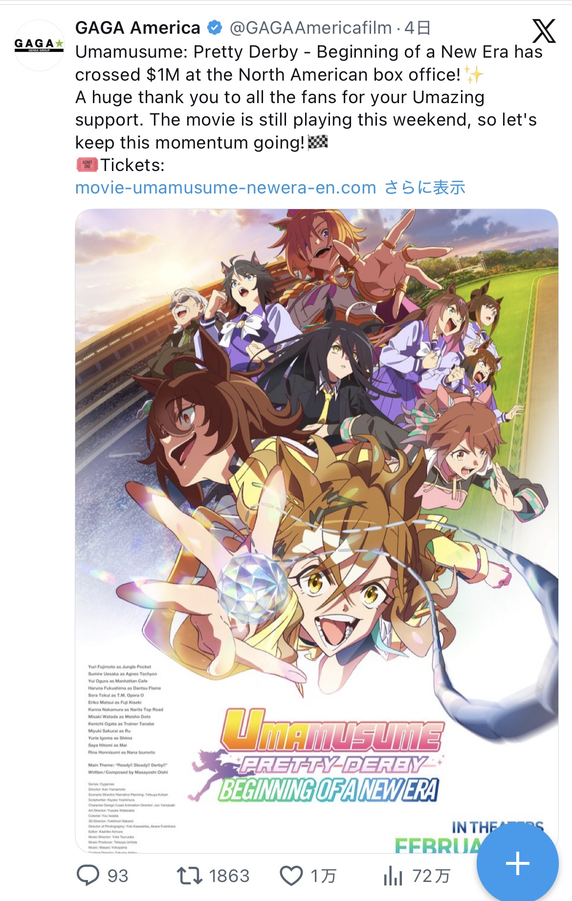 | … | 28無念Nameとしあき26/03/09(月)16:04:51No.1392713021そうだねx2北米進出した『ウマ娘』映画、初週末興収は90万ドル…600館以上と異例の配給規模 |