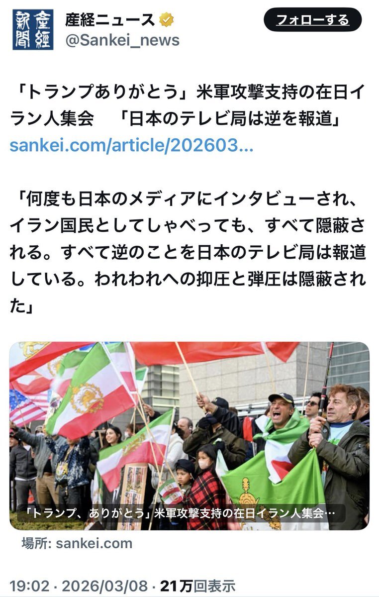 | … | 75無念Nameとしあき26/03/09(月)19:28:10No.1392748166+>世界中の大勢のイラン人たちが大喜びでアメリカとイスラエルに感謝のパレードしてるよ |
