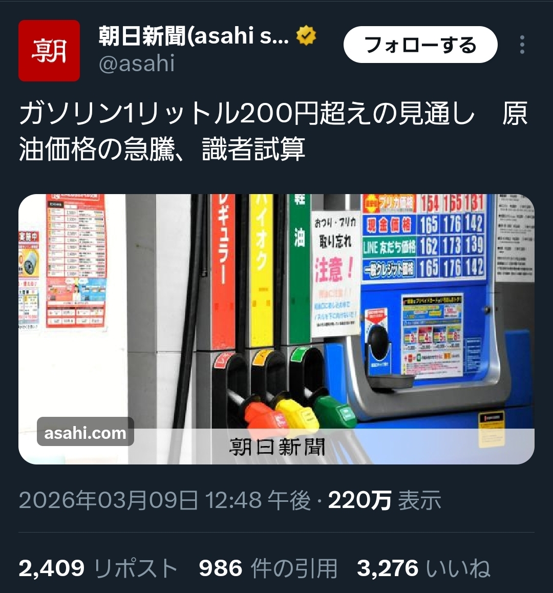 | … | 583無念Nameとしあき26/03/09(月)21:13:36No.1392778197+>>本格的にガソリン爆騰するとしたら何月くらいからになりそうなん |