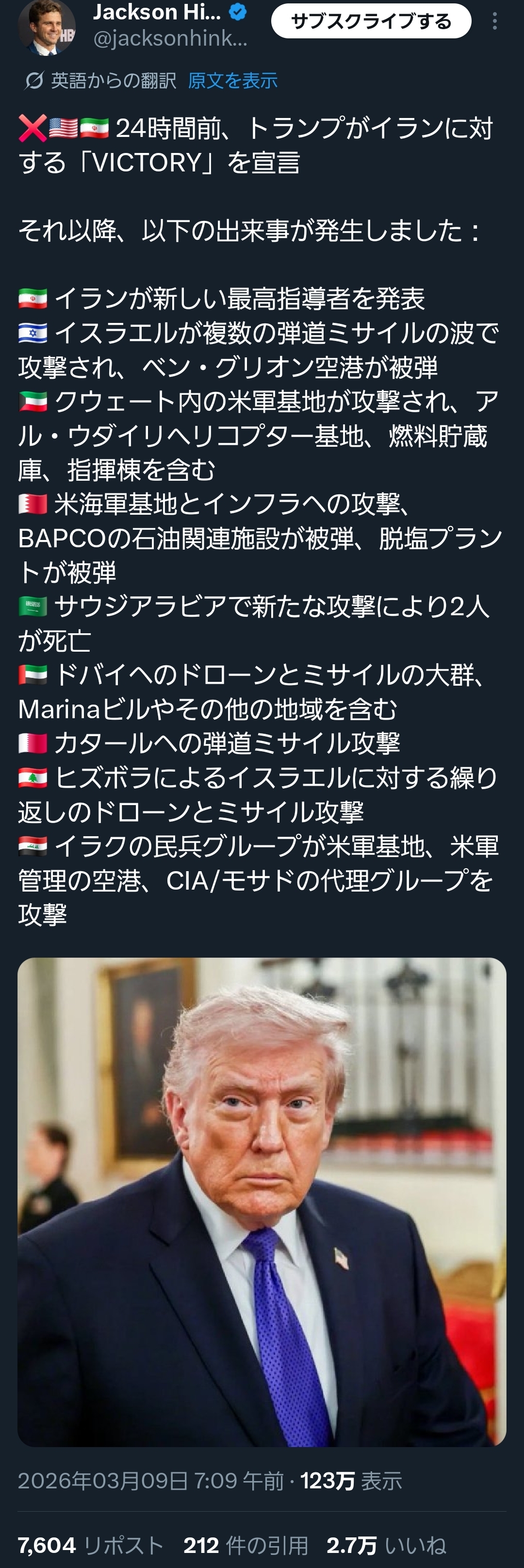 | … | 568無念Nameとしあき26/03/09(月)21:11:03No.1392777473そうだねx1 1773058263641.jpg-(366914 B) 米ウォールストリート・ジャーナル紙などが報じたところによると、UAEドバイの実業家ハラフ・アフマド・アル・ハブトゥール氏は同日、X(旧ツイッター)にアラビア語で長文の書き込みを行い、米国のイラン攻撃が中東全体を危機に陥れたと批判した。 |