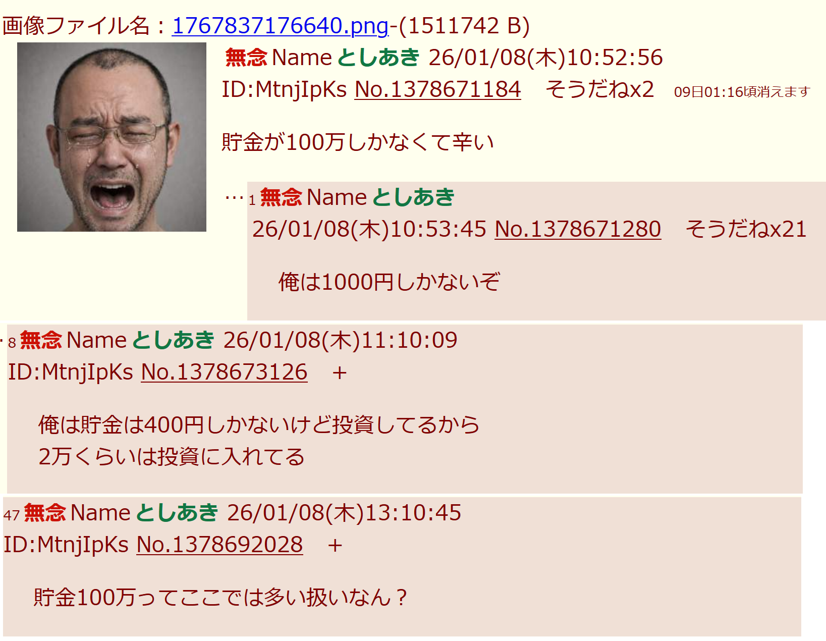 | … | 140無念Nameとしあき26/03/09(月)22:12:45 ID:51qxqCxoNo.1392796241+>俺は優しいからスレあきが必死に考えた理想の40代像を聞いてやってもいいぞ |