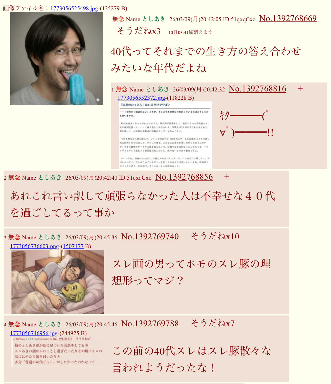 | … | 4無念Nameとしあき26/03/09(月)20:45:46No.1392769788そうだねx10 1773056746956.jpg-(244925 B) この前の40代スレはスレ豚散々な言われようだったな! |