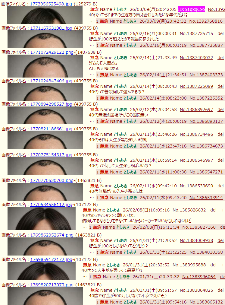 | … | 59無念Nameとしあき26/03/09(月)21:12:23No.1392777820そうだねx1>この前の40代スレはスレ豚散々な言われようだったな! |