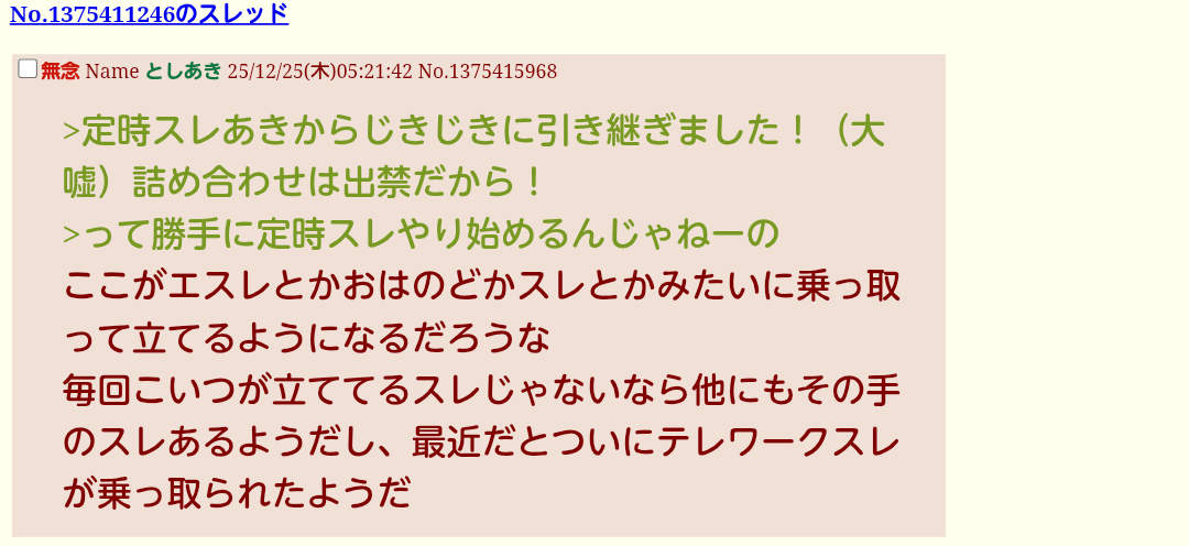 | … | 55無念Nameとしあき26/03/09(月)21:09:38No.1392777090そうだねx6>テレワークスレのアイツかなと思ったらその通りだった |