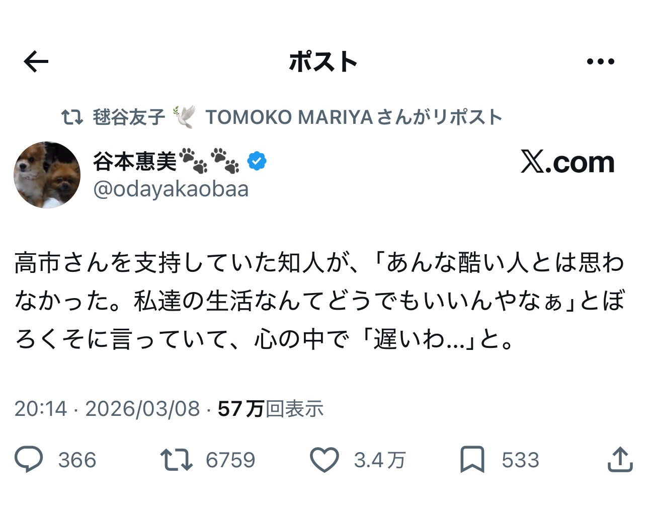 | … | 8無念Nameとしあき26/03/09(月)23:00:38No.1392808777そうだねx47>高市さんを支持していた知人が |