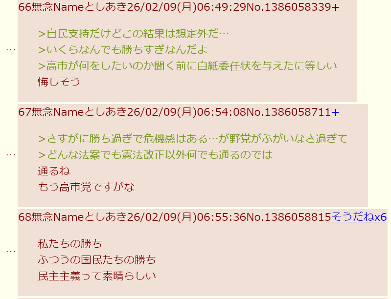 | … | 72無念Nameとしあき26/03/09(月)23:45:02No.1392819121そうだねx10>高市自民が猛烈に支持されたというより |