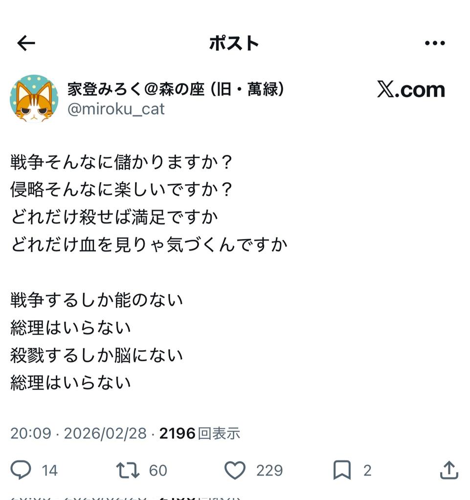 | … | 52無念Nameとしあき26/03/09(月)23:33:21No.1392816353そうだねx7パヨのエコチェンが加速しまくって自民が戦争しないと理論破綻が起きるとこまで行っちゃったのが外に溢れてきただけなんだよなぁ… |