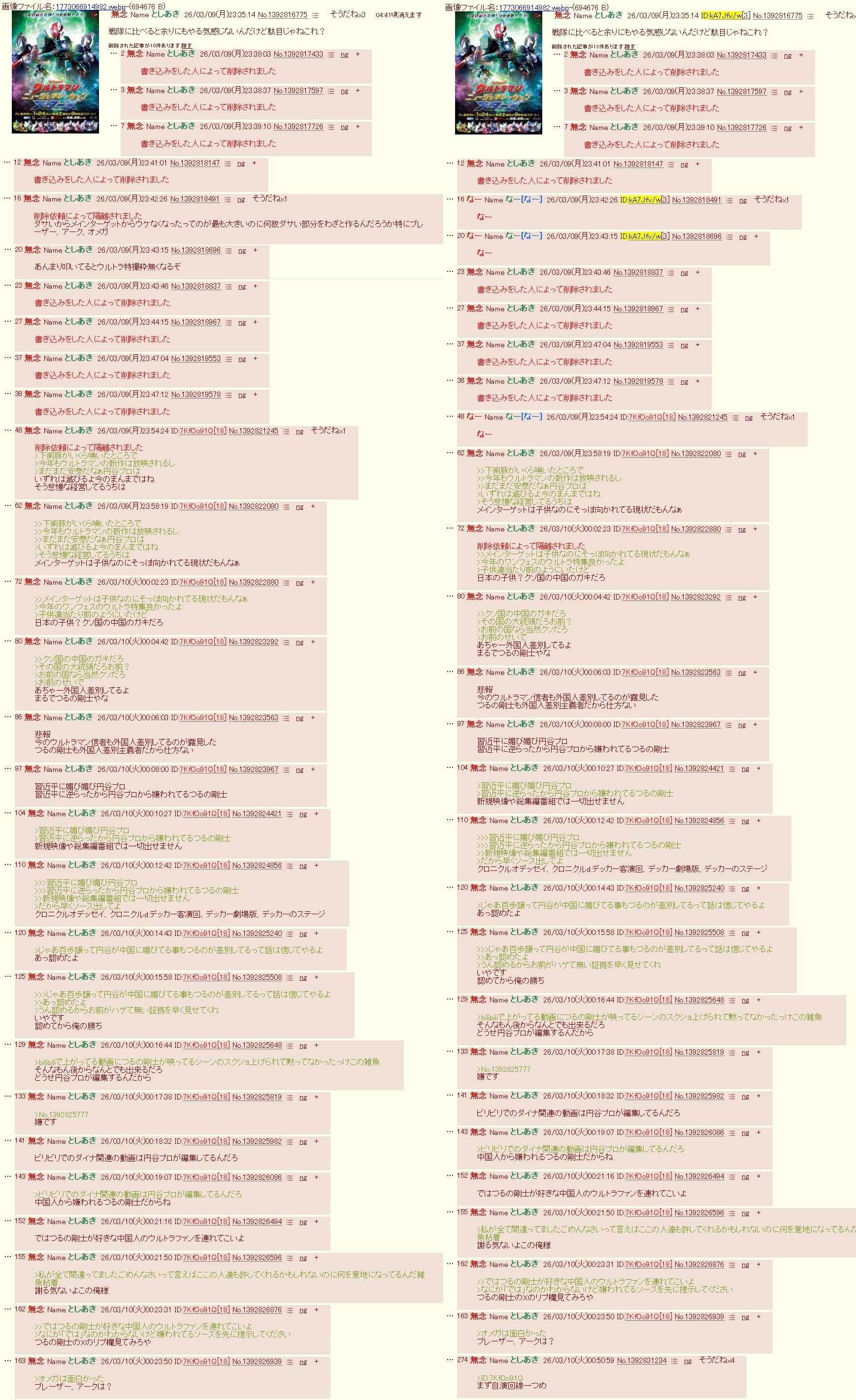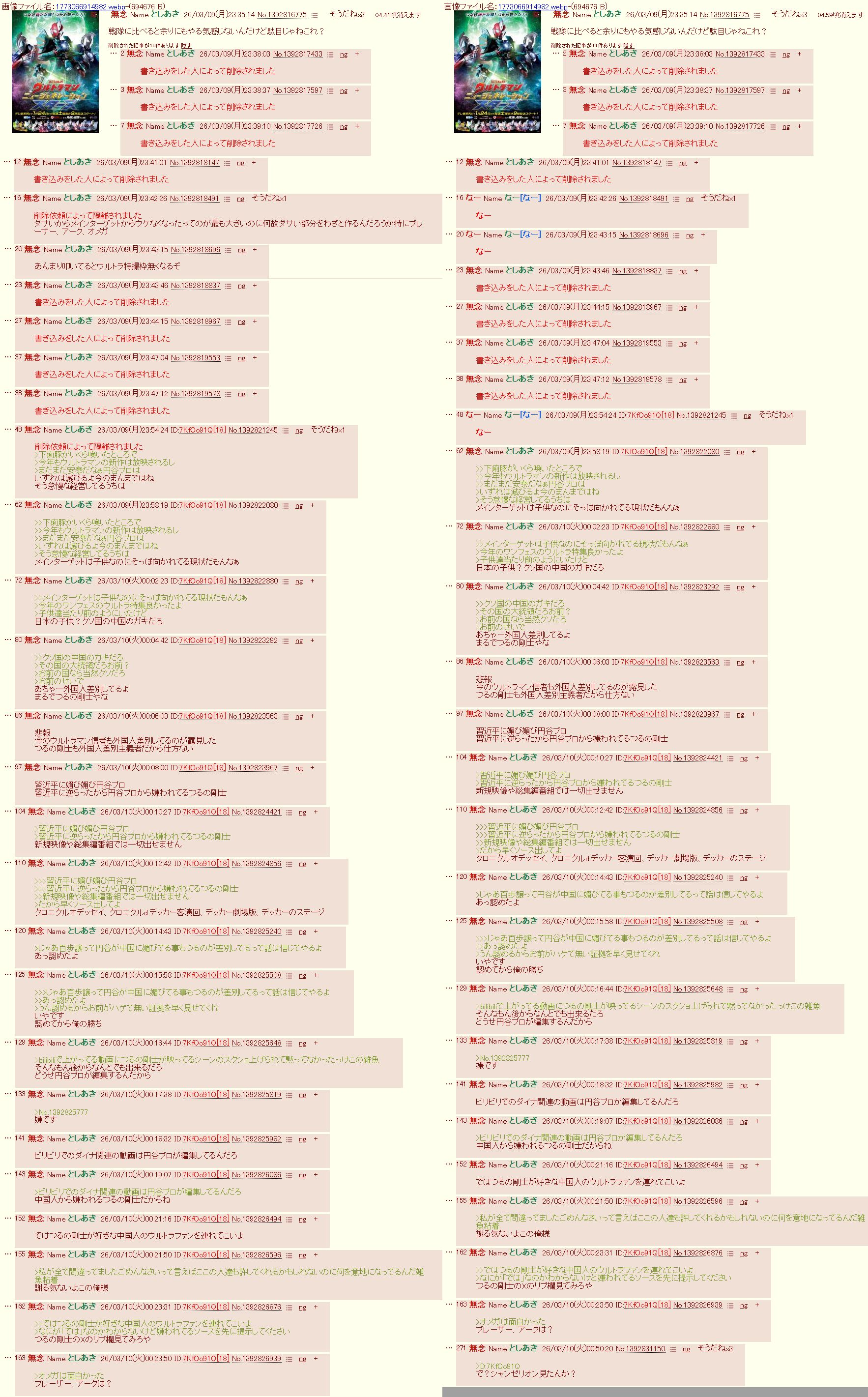 | … | 648無念Nameとしあき26/03/10(火)03:42:06No.1392842182そうだねx2この人起きたらまた円谷プロやウルトラシリーズに対して誹謗中傷を繰り返すのでしょうね… |