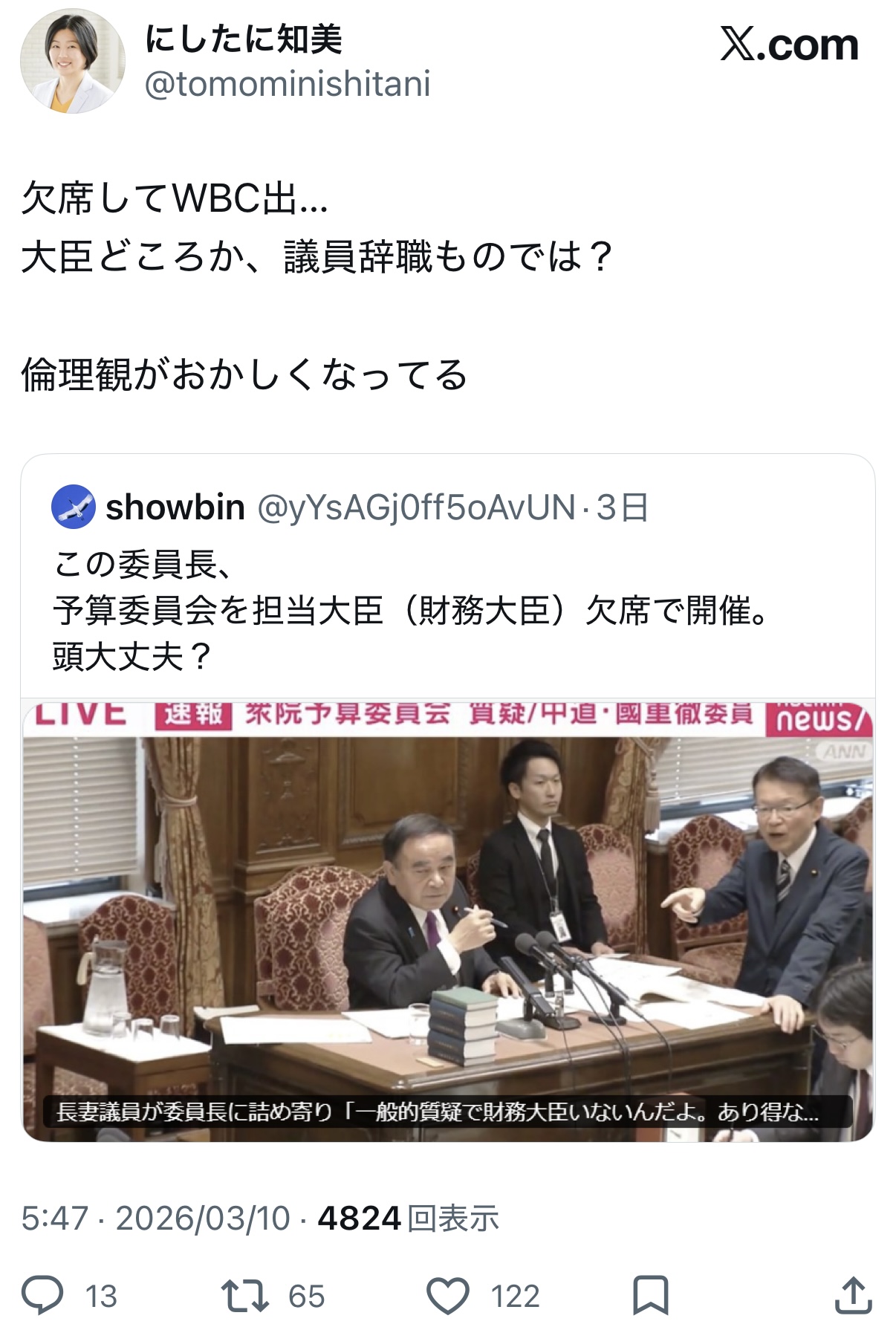 | … | 500無念Nameとしあき26/03/10(火)12:16:32No.1392885440+変な女がWBC見に行った閣僚は辞任すべきとか言ってた |