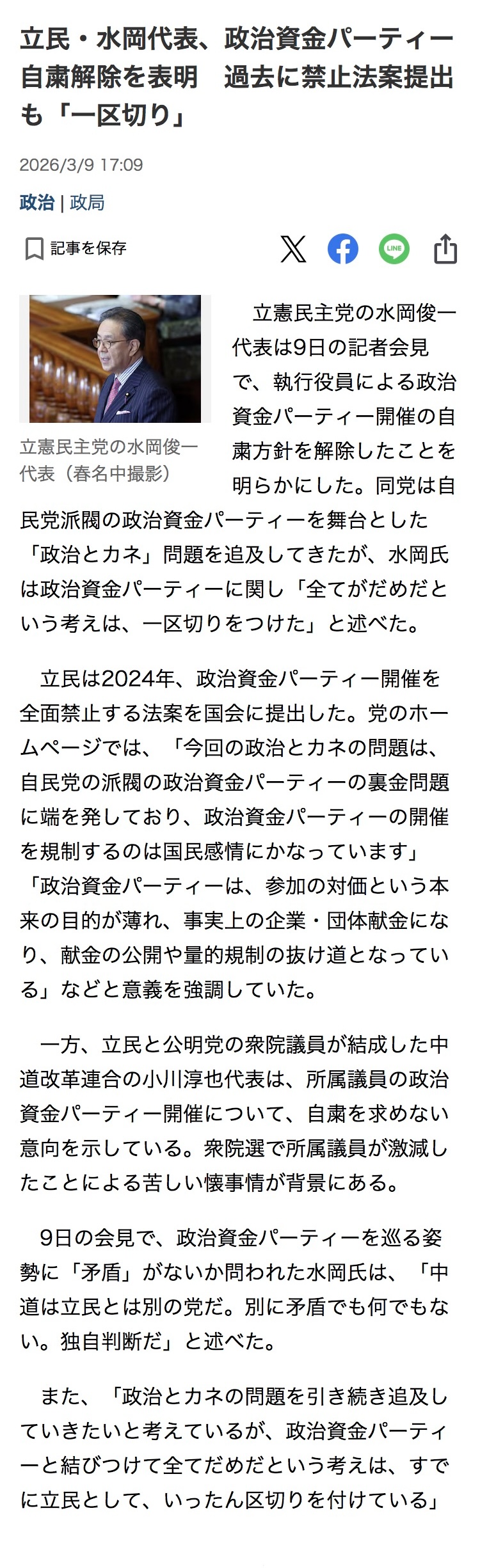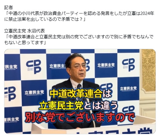 | … | 85無念Nameとしあき26/03/10(火)08:05:06No.1392853695+>>9日の会見で、政治資金パーティーを巡る姿勢に「矛盾」がないか問われた水岡氏は、「中道は立民とは別の党だ。別に矛盾でも何でもない。独自判断だ」と述べた。 |