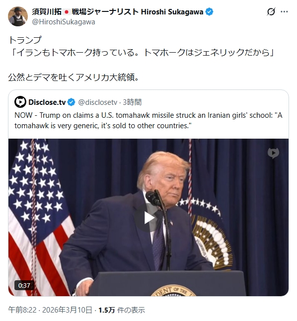 | … | 69無念Nameとしあき26/03/10(火)11:22:50No.1392876915+トマホークの残骸拾い放題だし証拠と言われてもね |