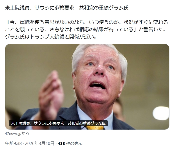 | … | 80無念Nameとしあき26/03/10(火)11:26:17No.1392877368そうだねx2アメリカはサウジとか巻き込みたくて仕方ないだろう |