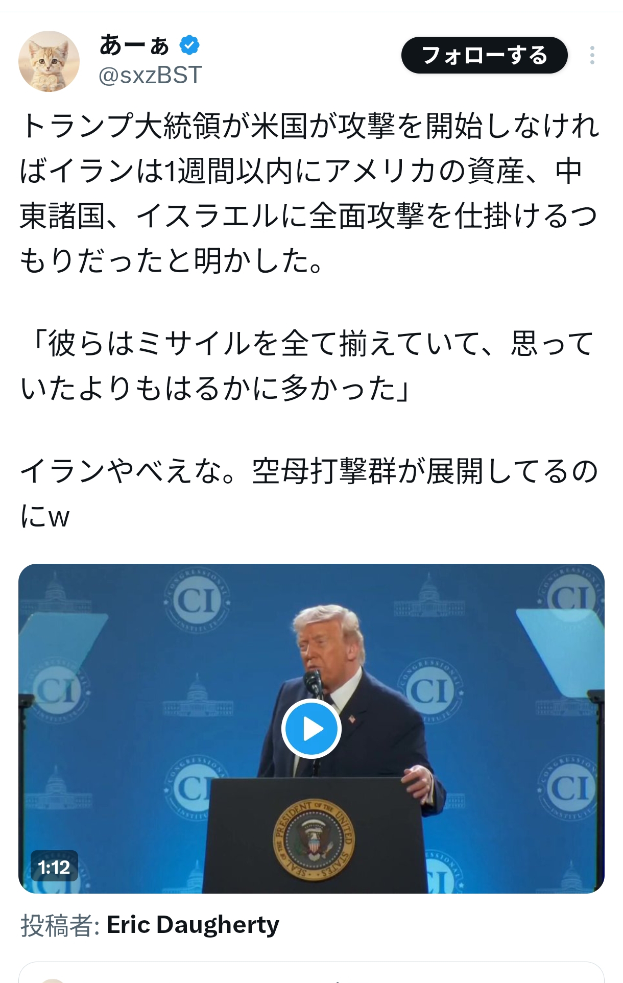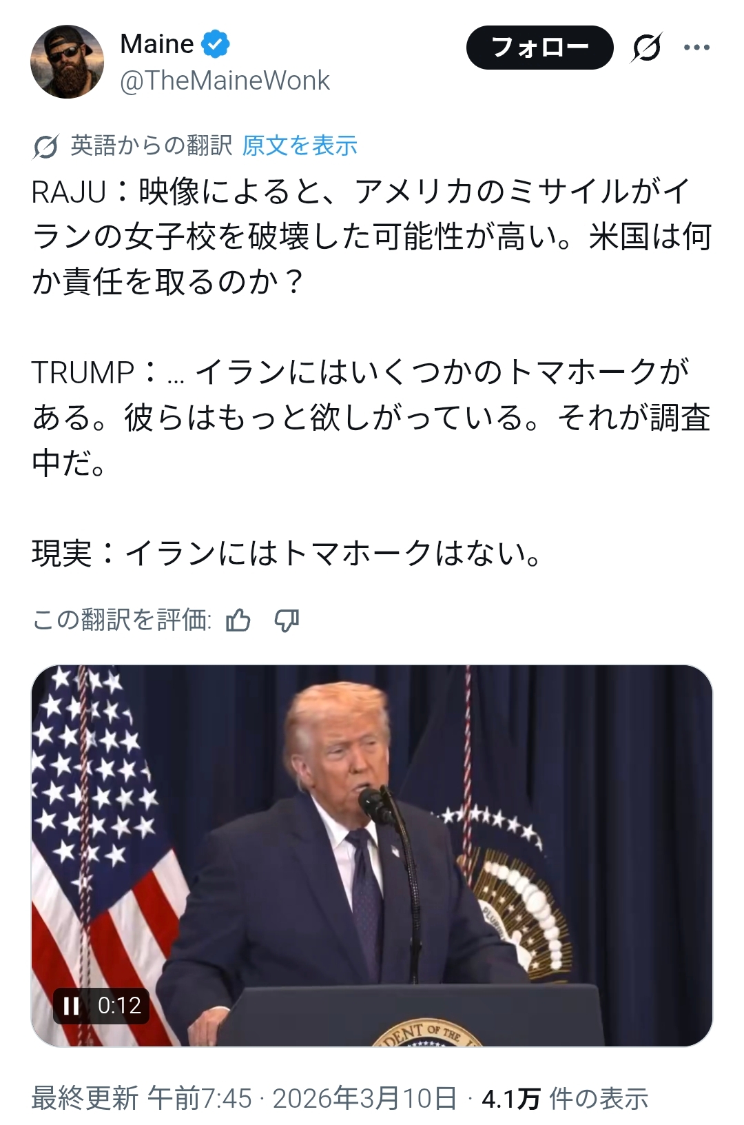 | … | 53無念Nameとしあき26/03/10(火)11:18:22No.1392876325そうだねx1 1773109102034.mp4-(1685568 B) 記者「あなたはイランがどうにかしてトマホークを入手して小学校を攻撃したと主張していますが政府内でそう言ってのはあなただけです」 |