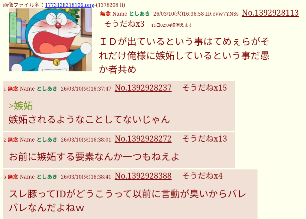 | … | 69無念Nameとしあき26/03/10(火)16:52:47No.1392930633そうだねx2ID出てるヤツは決まってお前らのあのスレがー!って言い出すけど |
