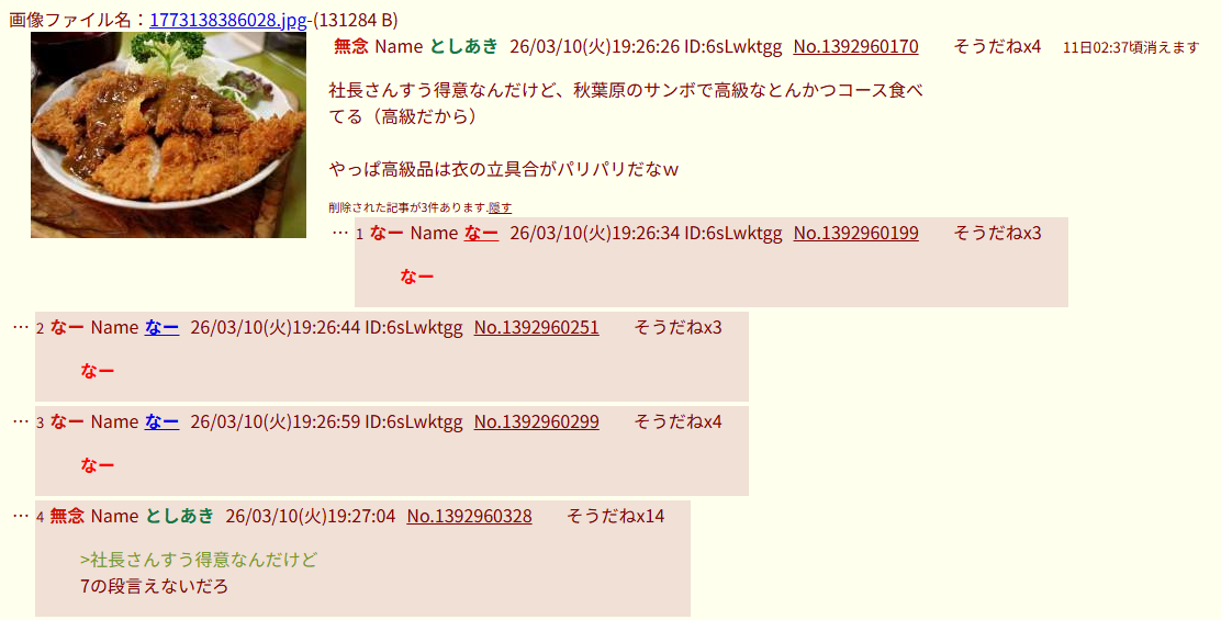 | … | 22無念Nameとしあき26/03/10(火)19:31:19No.1392961396そうだねx12>>サンボにとんかつはねえよバカ |