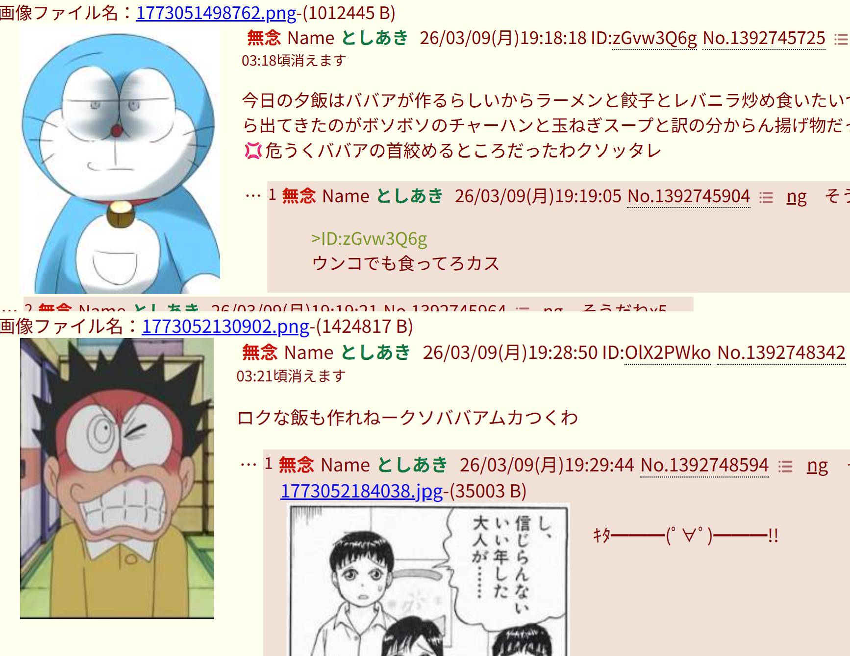 | … | 6無念Nameとしあき26/03/10(火)22:46:04No.1393014986そうだねx1「ふたばちゃんねるなんて、俺様が荒らしてやる」というドラえもんがスレ画のクソスレ |