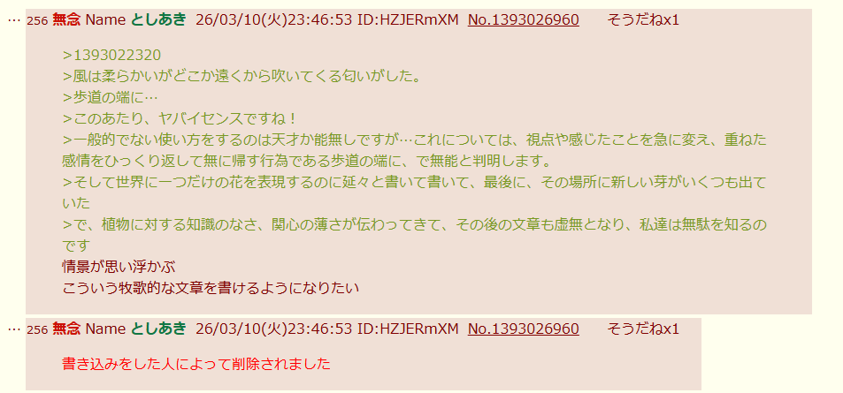 | … | 275無念Nameとしあき26/03/10(火)23:55:43No.1393028607+>何かと勝負する為にポエム書いてんのかい |