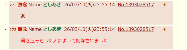 | … | 273無念Nameとしあき26/03/10(火)23:55:14No.1393028517+書き込みをした人によって削除されました |