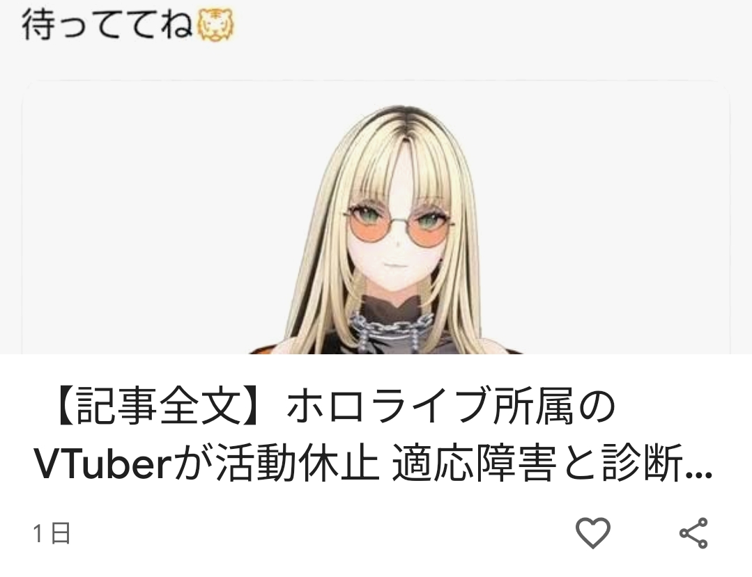 | … | 124無念Nameとしあき26/03/11(水)00:45:08No.1393036602そうだねx6>言っちゃあなんだがずっと配信してないライバー達も病名伏せてるだけで鬱や適応障害患ってるんだろと思ってるよ物部プロとか雨森とか |