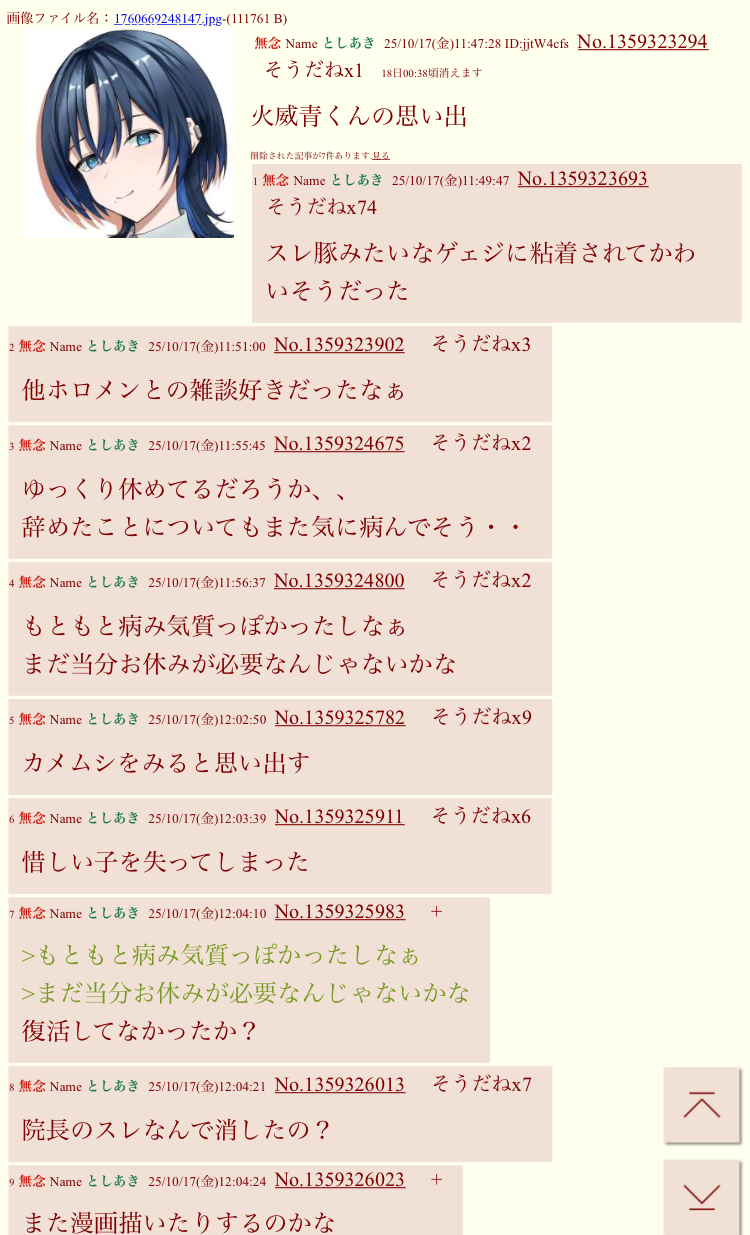 | … | 193無念Nameとしあき26/03/11(水)02:31:29No.1393045670そうだねx1>こういう人が全員死んだらホロメンもカバーも心休まるだろうなぁ |