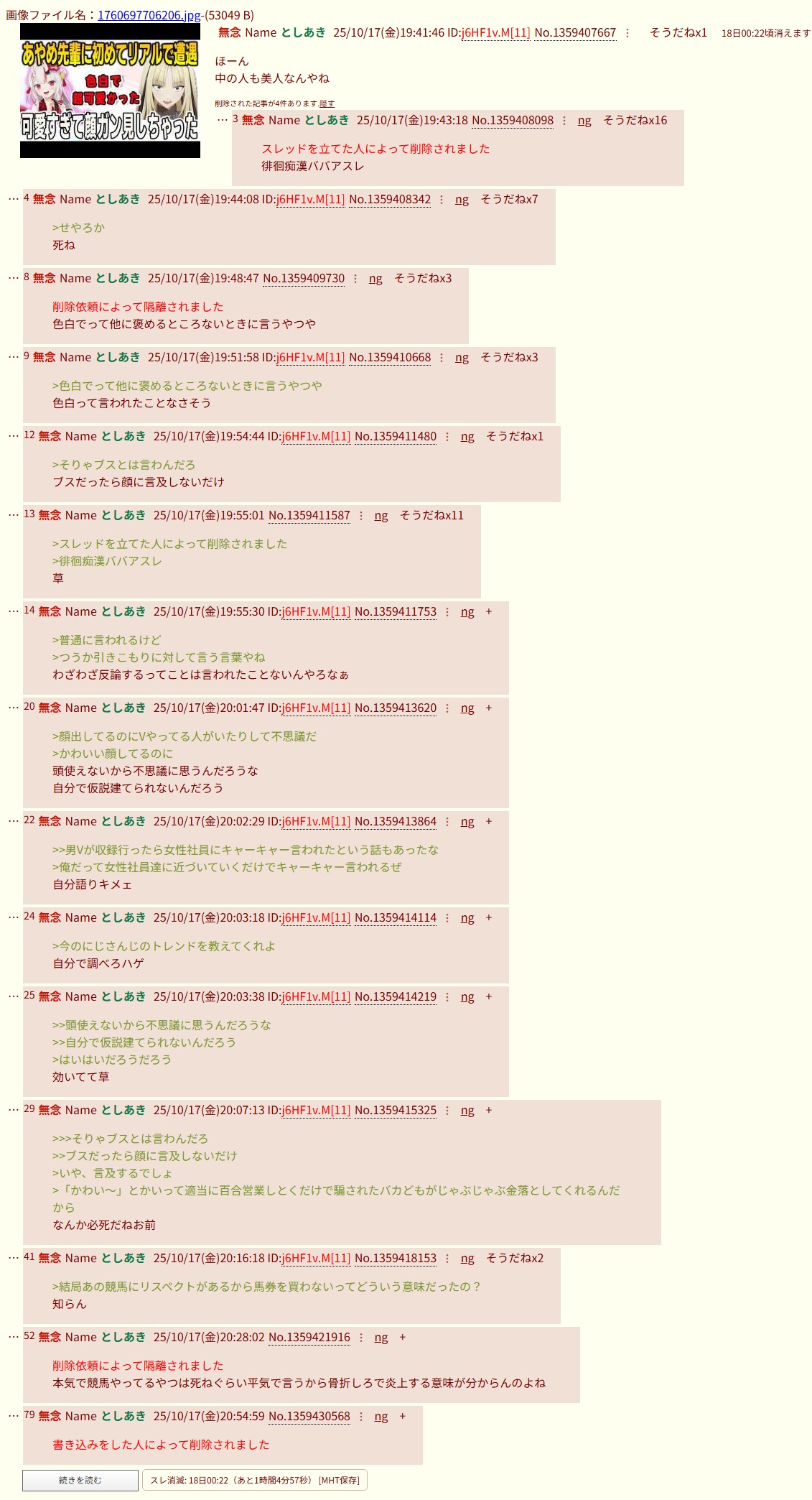| … | 18無念Nameとしあき26/03/11(水)00:14:28No.1393031893+書き込みをした人によって削除されました |
