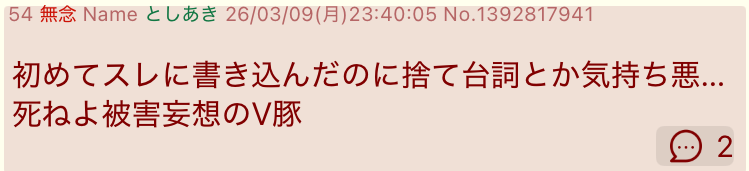 | … | 38無念Nameとしあき26/03/11(水)00:19:21No.1393032658+こいつにじ豚って呼べとか騒いで分断工作やってる奴か |