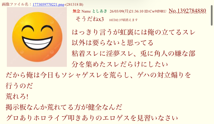 | … | 90無念Nameとしあき26/03/11(水)00:38:19No.1393035589そうだねx5 1773157099547.jpg-(310089 B) >にじさんじの配信みるよりホロメンの誹謗中傷で忙しい!! |