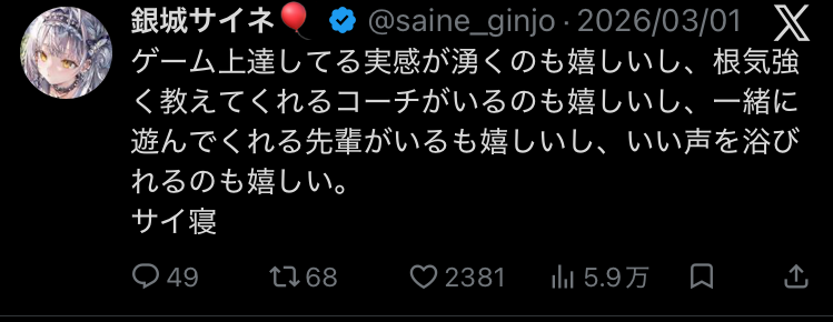 | … | 132無念Nameとしあき26/03/11(水)00:50:51No.1393037365そうだねx11 1773157851519.png-(77551 B) >サイネぶいすぽっ行ってから毎日楽しいってさ |