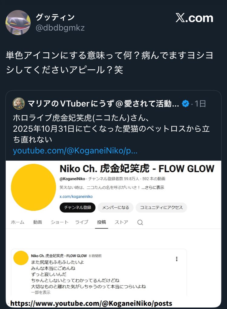 | … | 56無念Nameとしあき26/03/11(水)00:28:52No.1393034151+スレ画に関しては猫から続いてる物だけどあんたまたホロメンの悲しい出来事を茶化すのかい? |